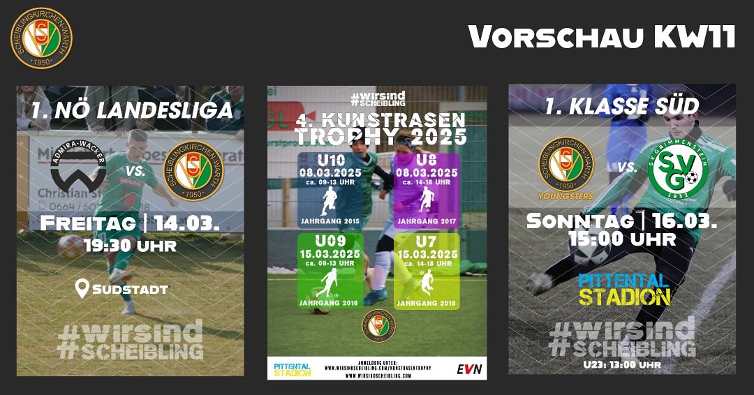 Vorschau auf die aktuelle Woche Vorschau auf die aktuelle Woche Freitag: 1. NÖ Landesliga – Auswärtsspiel bei den Admira Amateuren! 19:30 Uhr | Südstadt Samstag: 4. Kunstrasen Trophy – Tag 2 Nachwuchsfußball im Pittentalstadion! Sonntag: Derby in der 1. Klasse Süd!USV Youngsters vs. SV Grimmenstein 15:00 Uhr | Pittentalstadion U23 spielt um 13:00 Uhr#wirsindscheibling#immerweiter Felber2025-03-11T05:05:43+01:00Teile diesen BeitragFacebookXRedditLinkedInWhatsAppTumblrPinterestVkE-Mail