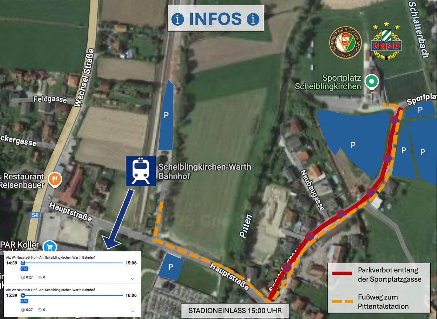 Entlang der Sportplatzgasse besteht ein Parkverbot. Diese Zonen sind im Anreiseplan rot markiert.